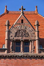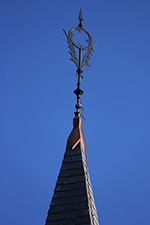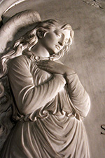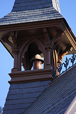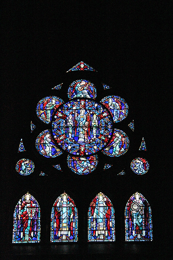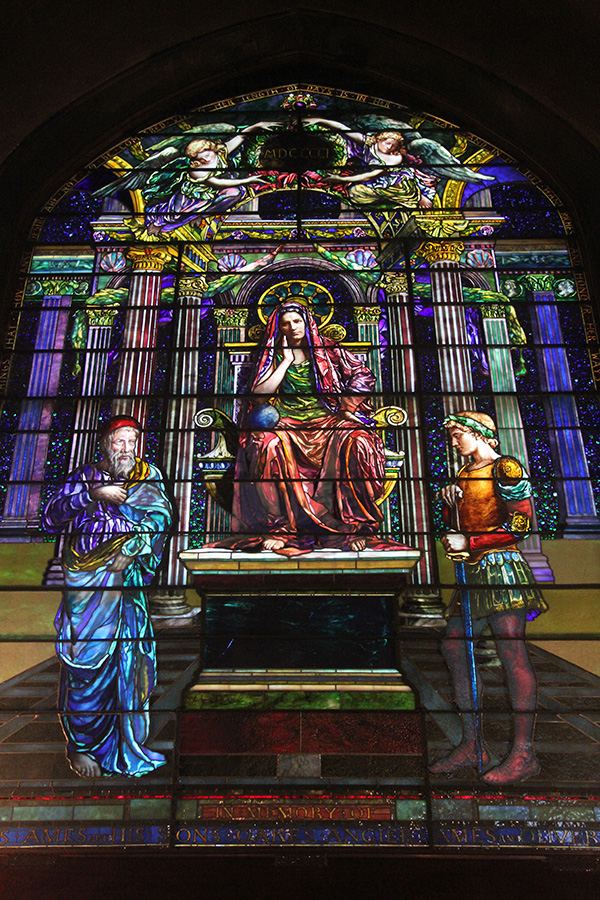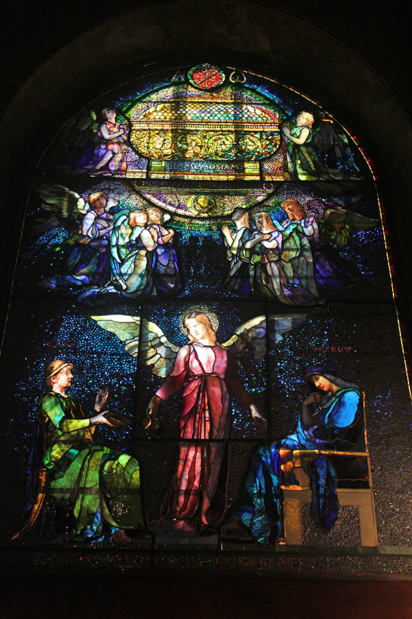 based on fred ames' recommendation, we went further north up main street to see the unity church, where apparently there were some fine stain-glass windows designed by john lafarge. we were told to listen for the sound of the organist playing his pipes inside. although he wasn't there when we arrived, bernie the sexton was working the grounds and was kind enough to let us inside. a vietnam vet (judging from the vietnam war service ribbon bumper sticker on his minivan), bernie wore turquoise earrings and had painted fingernails like an aging rockstar.