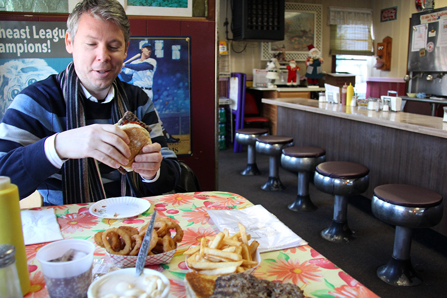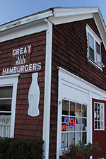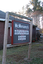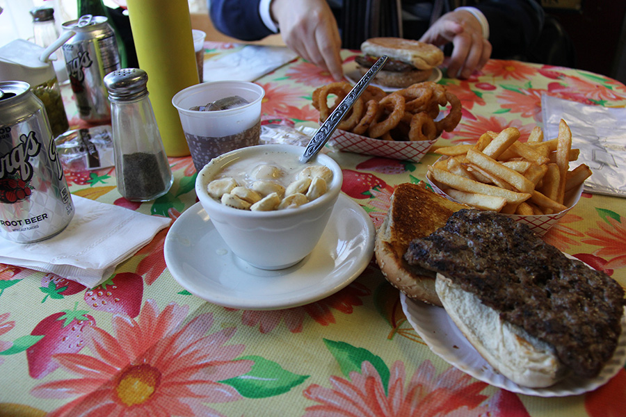 mcmenamy's hamburger house turned out to be the perfect place, with interior decor reminiscent of a truck stop diner. drew wanted to sit by the retro countertop but i suggested we take a table instead (better to hold our bags and jackets). the little restaurant doesn't seem like much from the outside, but business was brisk inside, and the large parking lot in the back is a clue that they can accomodate even more customers. when i saw the prices on the food though, i fell in love with mcmenamy's. $2.40 for a hamburger? $3.05 for a steak burger? back in cambridge, a burger might cost $10. so i ordered a steak burger, some fries, a root beer, and a cup of clam chowder. drew had a steak burger with cheese, some onion rings, and a root beer as well. the chowder was okay and so were the fries, but the steak burger was good enough to come back. it was unusual that it was served as a flat rectangular patty, but it had a nice fire barbecue flavor.
