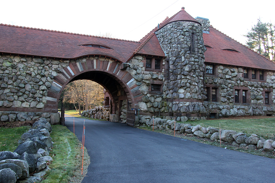 the 2 remaining richardsonian sites were private residences. how much we'd get to see depended on the tolerance of the homeowners to trespassers. we came across the ames gate lodge first, drew the first to point it out ("there it is!"). we parked in the near empty town office lot almost directly across the street. i was a little hesitant to be walking the grounds of the gate lodge, given the prominently displayed "no trespassing" sign (they must get a lot of visitors). galvanized by seeing another richardsonian site, drew was unswayed, and walked right through the gate. his view was we'd explore until somebody tells us otherwise.