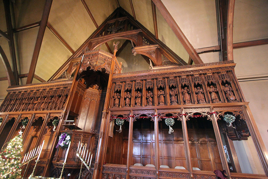 this unitarian church was built by the ames family in 1875 in a gothic revival style. inside was some impressive woodwork, carvings of celestial angels each playing a different musical instrument, by johannes kirchmeyer, a german-trained artist who immigrated to america. he's also responsible for mantling on anderson memorial bridge in harvard square. i noticed a lot of kleenex packets throughout the church. later i realized it was in anticipation of tomorrow's (sunday) sermon which would be about the sandy hook elementary school shooting.