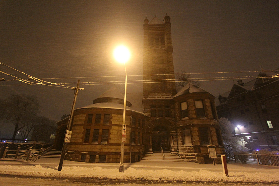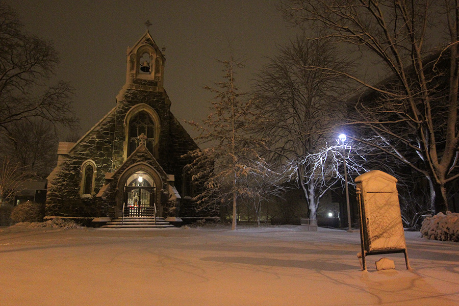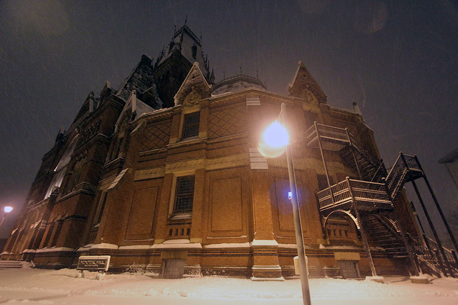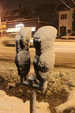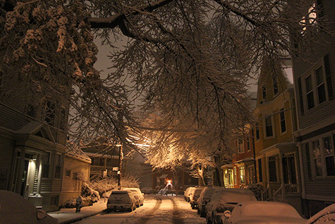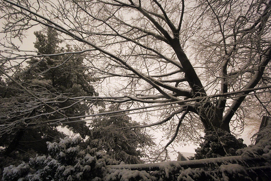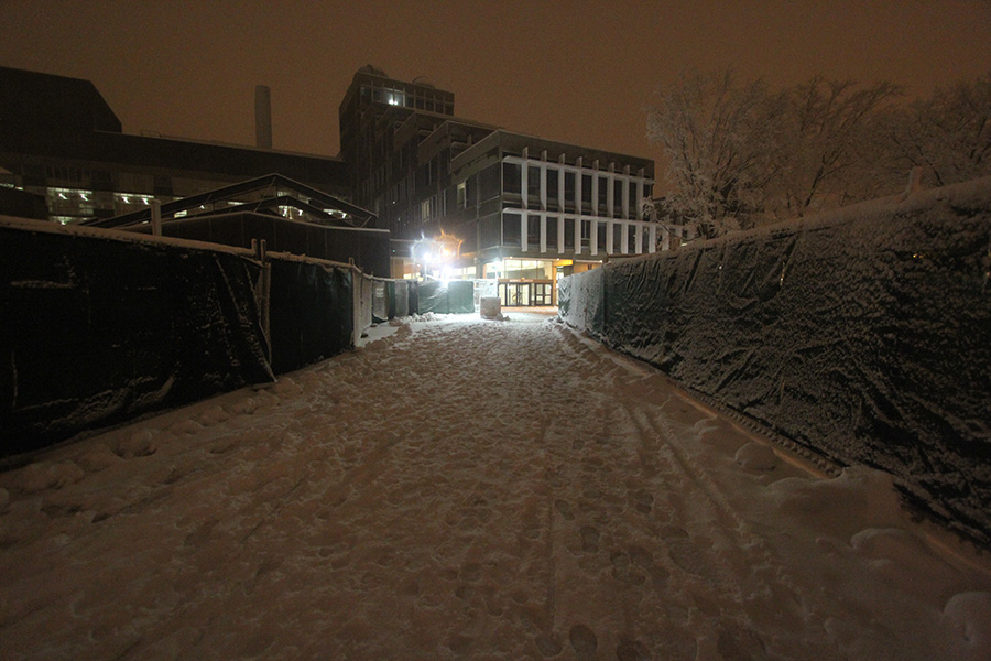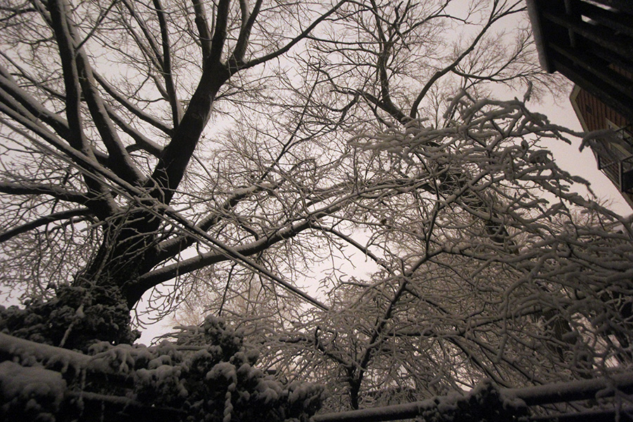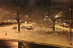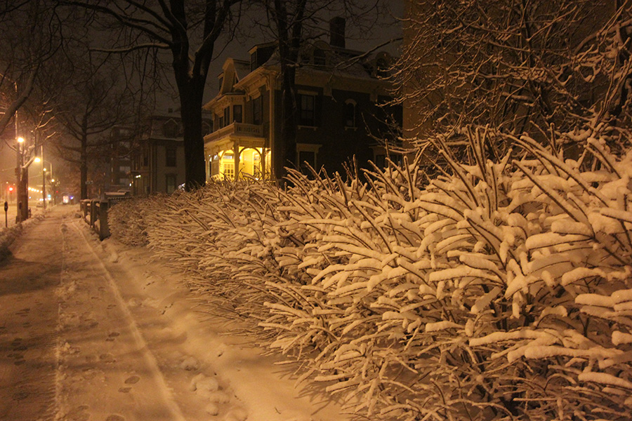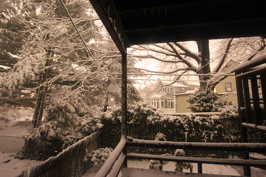 unlike rain, snow falls silently, so it's hard to gauge the severity without looking. unlike rain, snow accumulate into shapes depending on which way the wind blows and the type of snow. approaching midnight the precipitation was already tapering down. i went out and shoveled the sidewalk before it had time to freeze.
