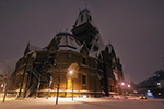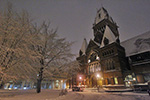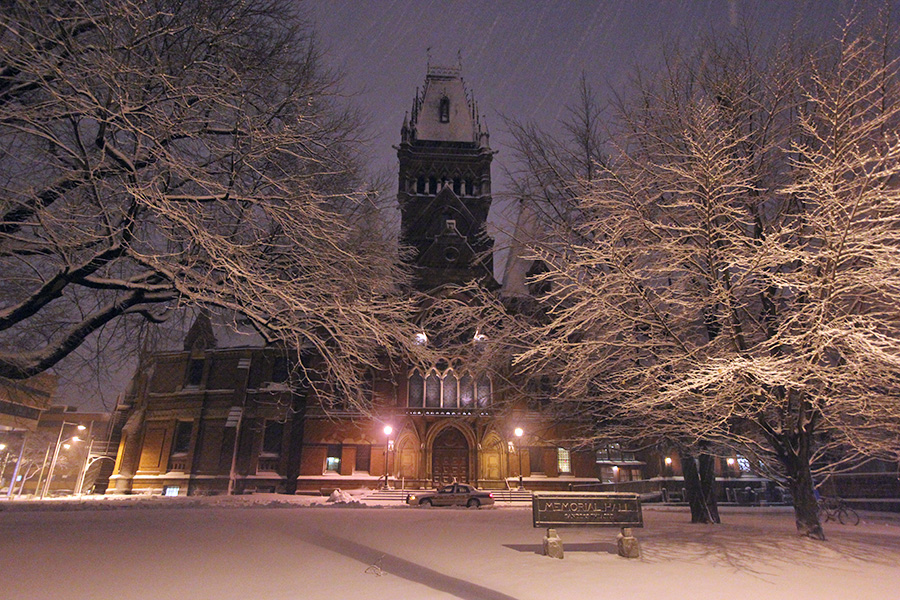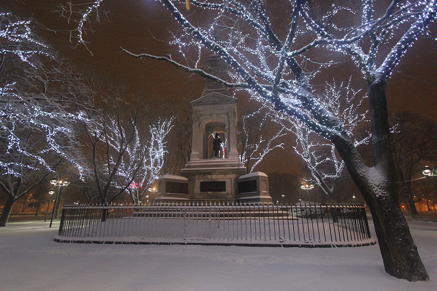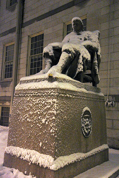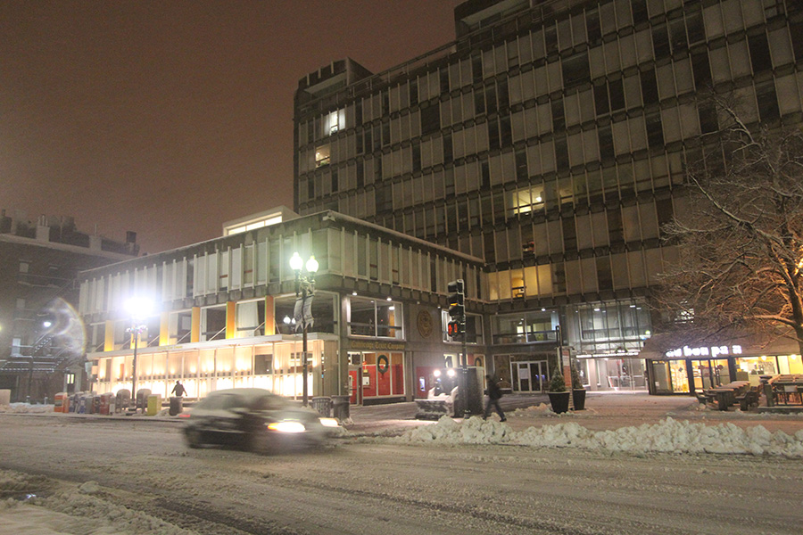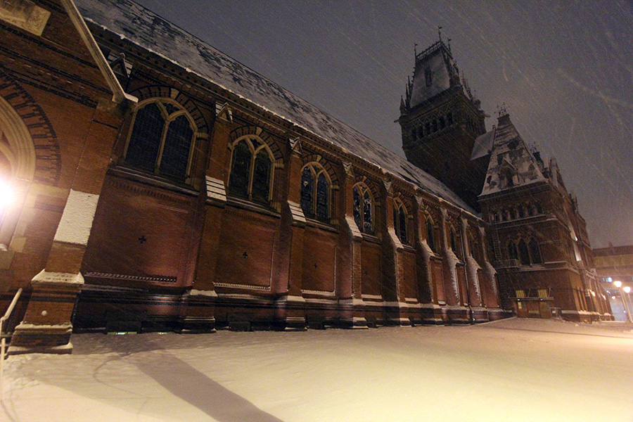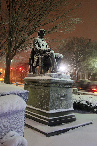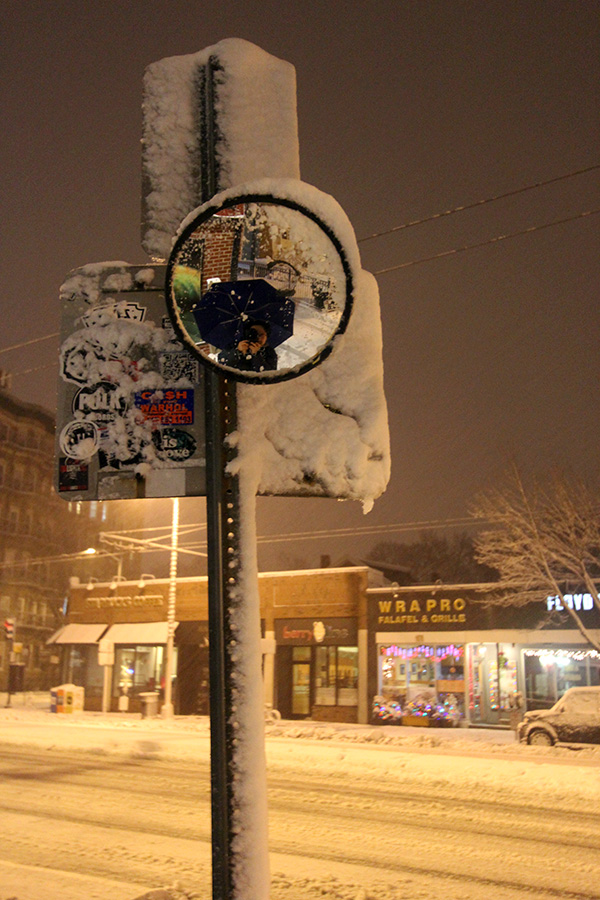 this was a heavy wet snow that tends to clump and stick to branches. not sure what's the official cambridge snowfall amount, but it varied anywhere between 2-4". i walked in the streets because most of the sidewalks hadn't been shoveled yet. i also had my umbrella because i didn't want to get the lens wet; when i wasn't shooting i tucked the camera inside my jacket. i headed in the direction of harvard square. most of the university properties had already been plowed, a combination of snowblowers, trucks, and sidewalk plows. occasionally i'd see some like-minded folks out enjoying the snowy landscape and taking photos. there weren't that many people though since the students are all gone on winter break.