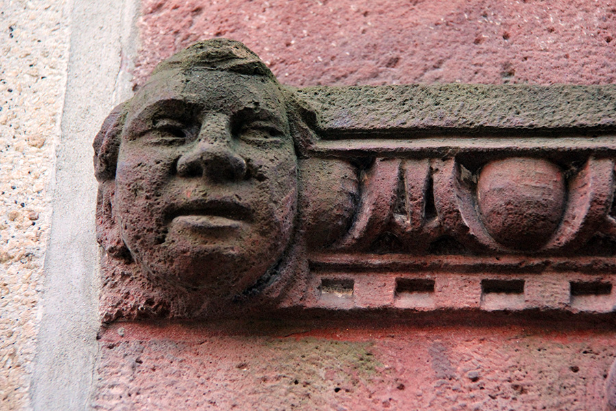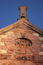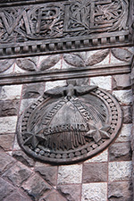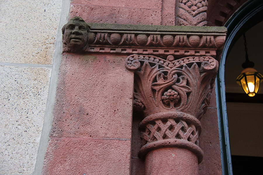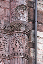 not sure who designed this building nor the architectural style, but the ornate doorway is definitely romanesque with interesting little carvings. i also like the polychromy.
