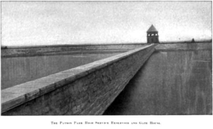 once again, there's mention of view from the gate house tower. i did some more digging in the archives and found an grainy photo of the reservoir. sure enough, the gate house looks different, and it seems early on there actually was an observational tower. i don't know how accurate the reservoir height is. wikipedia claims the 1907 published height for harvard's memorial hall is 190 feet. maybe the 2 are measured from different base heights.