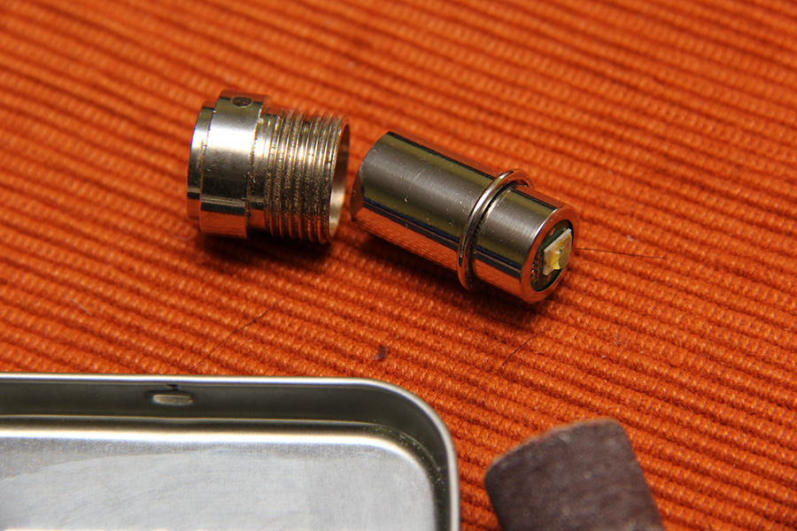anyway, we finally figured out how to completely disassemble the flashlight head, including snipping off one of the wires (to be replaced in the future with a longer wire).