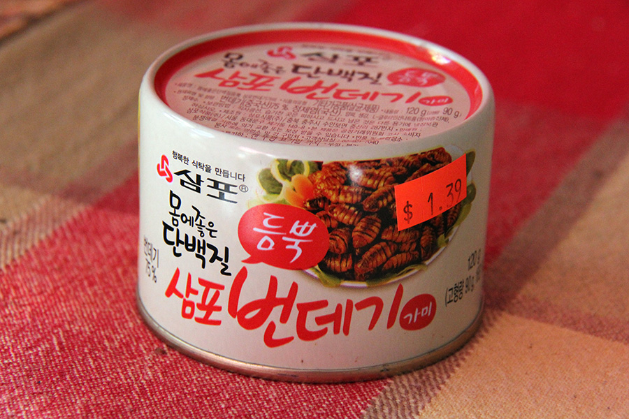 and a jar of furikake from the korean supermarket in union square. here's something else i bought there: canned silkworm pupae! i couldn't believe it when i saw it on the shelves. it wasn't just a one-off thing, there were actually 3 different brands of insect eggs! i couldn't resist, i just had to get a can to try out. not that insect pupae is anything new to me, i've had them before in my traveling days. i remember they're slightly crunching on the outside and soft (like mayonnaise) on the inside.