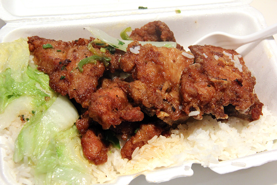 afterwards i double-backed and got onto harrison street on the other side of the turnpike to grab some takeout lunch at the chinatown cafe. i just got my usual R45 spicy salt and pepper pork chop with rice. the price had gone up, now it's $7.