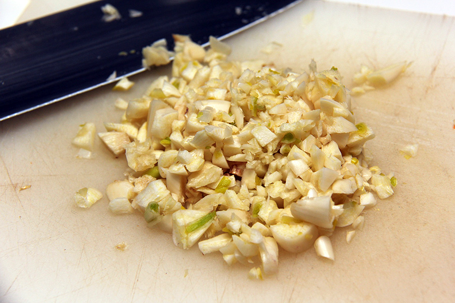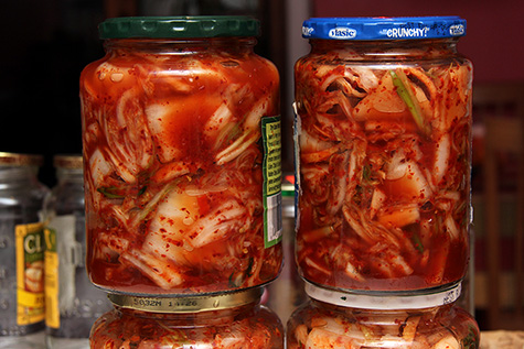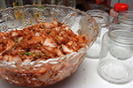 i was just going to make some ramen for dinner when i suddenly realized i forgot to add the garlic. so after chopping up 15 small cloves of garlic, i emptied out the 4 jars of kimchee into the punch bowl and remixed everything. some liquids were lost in the process but fortunately i still had some reduced liquids saved up that i poured into the jars. i screwed on the lid, shook up jars, then unscrewed the lid to allow gases to escape during the next few days of fermentation. this is the stage where the kimchee really comes to life.