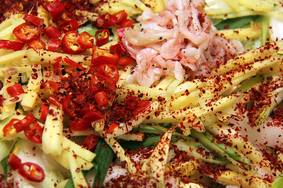 ginger, thin sliced thai hot peppers, chopped scallions, diag. sliced 15 garlic cloves, chopped 1 tbsp salted shrimp 8 tbsp red pepper powder |