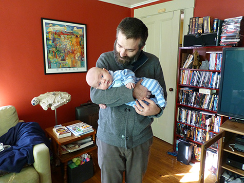 after going to market basket and picking up a few things for my parents, i biked to the cafe to borrow the car so i could visit elias in the late morning. his old 42" panasonic HDTV recently broke and he asked me if i wanted it in the oft chance that i might be able to fix it. at first i wasn't sure, but sad to see a perfectly good (albeit slightly broken) HDTV going to waste so i agreed to take it. amanda was off at work while elias telecommuted from home so he could take care of baby alvida. i admired his new 52" panasonic plasma HDTV (especially how thin it was), including the fact that it has built-in 3D. we chatted about the greek language, which elias was trying to learn.