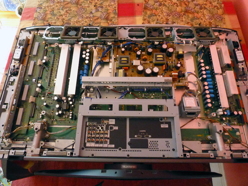 i placed each screw next to its original location so i can put it back later), i managed to take the back cover off to expose all the electronic guts inside. the panasonic TH-42PZ77U is actually easier to fix than most HDTV's (not that i've ever fixed any) because when it malfunctions it goes into a diagnostic mode by flashing an LED a certain number of times that helps to identify the issue. this one was flashing 7 times. i managed to find a troubleshooting repair document, and at the very least i can figure out what boards to be replaced. it could either be a relatively cheap fix or a cost-prohibitive expensive fix (in that case, i'll put the HDTV on craig's list for parts).