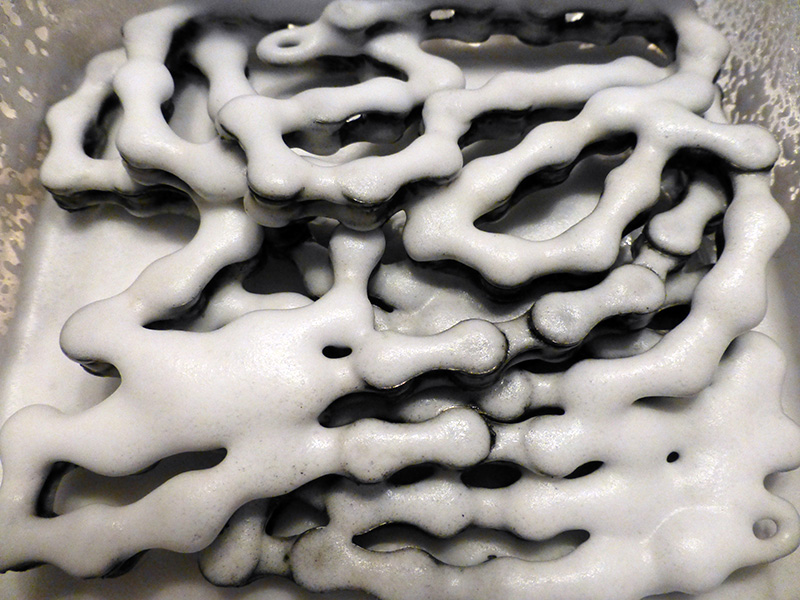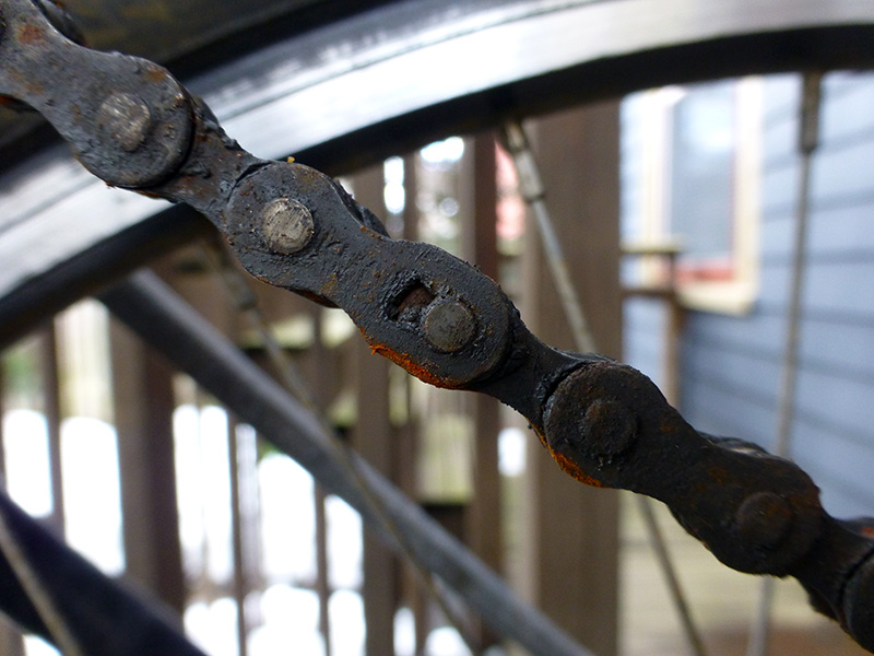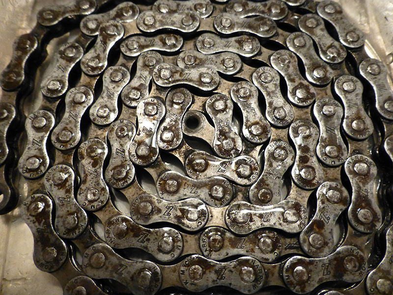 after locating the missing link segment, i managed to unhook the bike chain so i could give it a more thorough cleaning. i'd already wiped it down with a paper towel so it wasn't that dirty, but there was still plenty of grease in the crevasses. i used a can of simple green heavy duty BBQ cleaning foam to degrease the chain. as far as i know, i don't know if anyone else does this, but the BBQ cleaning foam is the exact same formula as the simple green bike cleaning foam, but at less than half the price.