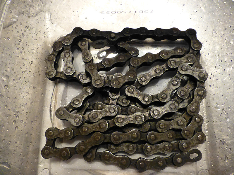 i don't know how well the cleaning foam works. i also mixed in some dishwasher fluid, which might've been equally effective. i used an old toothbrush to scrub the chain. after i was done, i dried off the chain and put it back on the bike. i forgot how the chain loops and had to check online for reference.