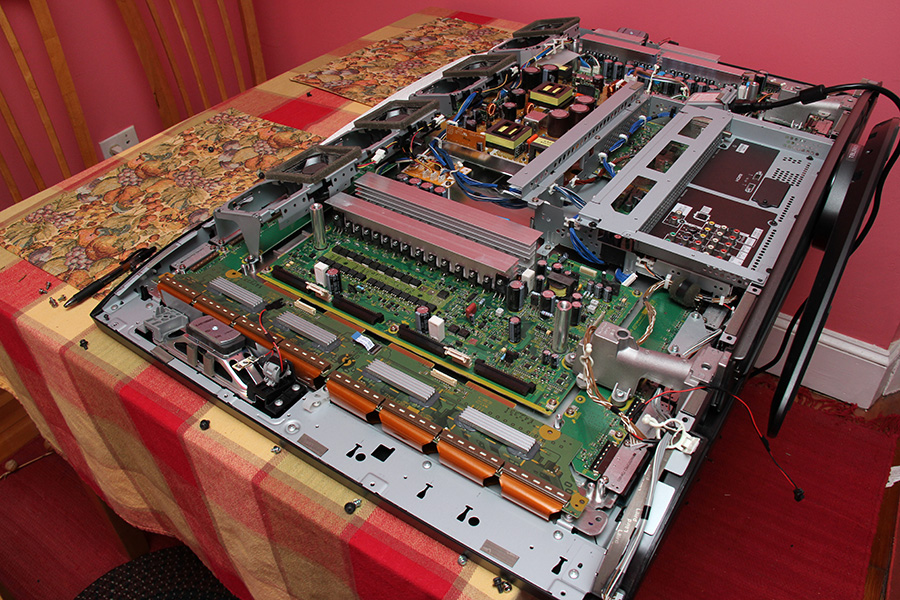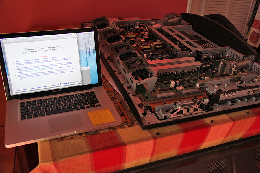 i "inherited" elias' panasonic TH-42PZ77U plasma HDTV last thursday and only now getting around to finally figuring out what's wrong. the service manual for the 7-blinking-lights error basically instructed me to unplug boards one at a time until the lights stop blinking which would mean the previously connected board was the bad one.