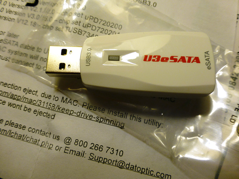 from the return address i already knew what it was but quickly tore open the padded envelope just to be sure: my U3eSATA adapter had arrived! somehow i thought it'd come in a box, but it's just a little dongle, so i could see why they shipped it in a packet, although i'm not sure if it's worth the $4.99 shipping/handling fee. there also doesn't seem to be any retail packaging, just a small piece of paper with some instructions in slightly-broken english. but the good news is it didn't get lost in the mail and i finally have it. did the mailman deliver it? or did a neighbor drop it off? who knows. i've test it within the next few days.