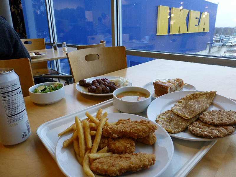 we hurried up through the showroom floor, then decided to get something to eat in the cafeteria after a bathroom break. my mother seemed a bit better after that. one ikea's special for today was free food if you spend over $100 in home furnishings. by that point my sister had decided against buying the dresser as well, but we dollars away from $100 so my sister got a dresser anyway, just so we could eat for free. the food itself wasn't anything that spectacular, basic cafeteria fare. i've eaten at ikea before so that wasn't anything new. i got the fried chicken fingers with fries (i'll basically eat anything that has the words "fried" and "chicken" in it), which at $5.99 wasn't that great. my sister got a plate of meatballs which also came with a salad and soup but the cashier ended up charging us for everything, which worked out in our favor at checkout time (you basically subtract the total from the cafeteria receipt).