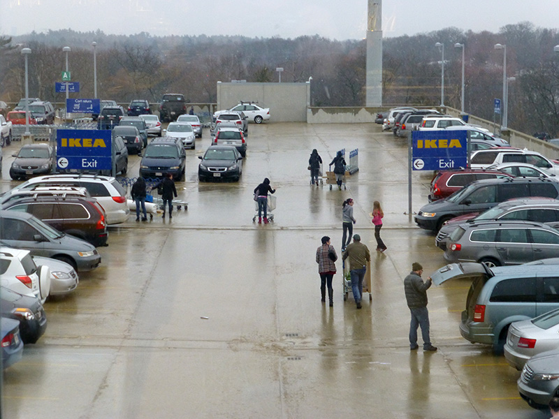 it took us about 45 minutes driving but we finally arrived around 2:00. ikea was busier than the typical weekend due to some special president's day weekend sales. the "below ground" parking lot was so full that we were directed to the roof parking instead, which wasn't ideal with the periodic light snowfall happening throughout the day. but the good thing was we were right at the same floor as the ikea building, so no escalators if we end up buying anything.