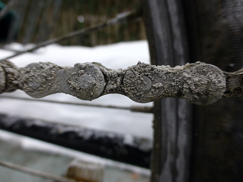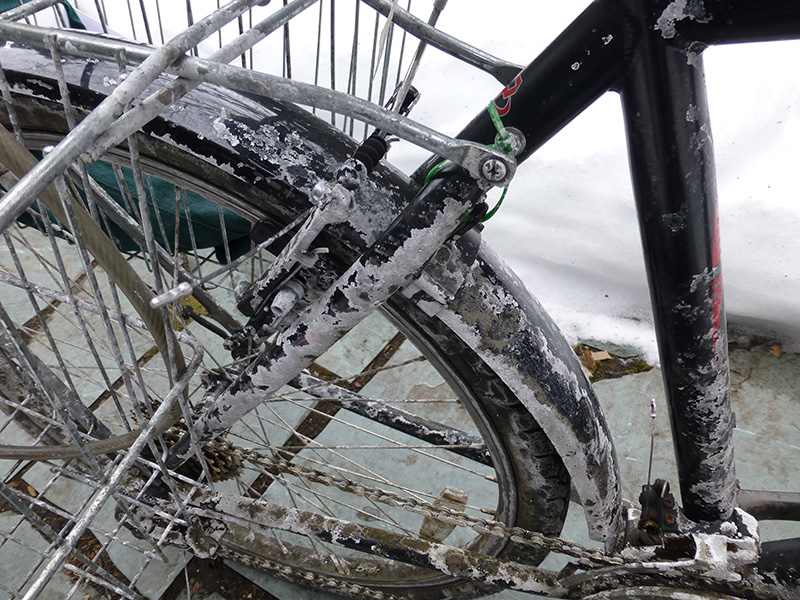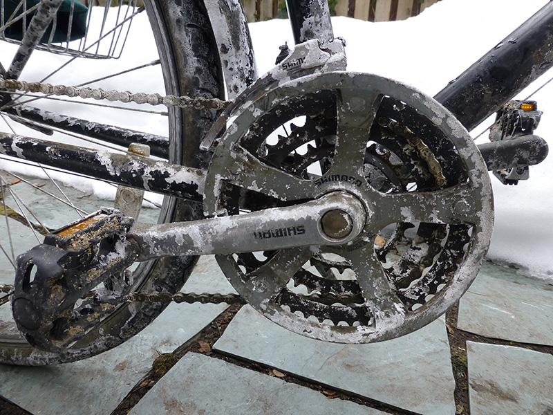 back at home, i washed the salt off my bike with a large bucket of warm water. if you love bicycles, seeing the amount of salt on my trek will probably make you cringe. new england winters are tough on bikes. but i like to think i keep my bike in relatively good shape. i've replaced virtually every single part at this point, and i'm sensible enough to at least wash the salt off.