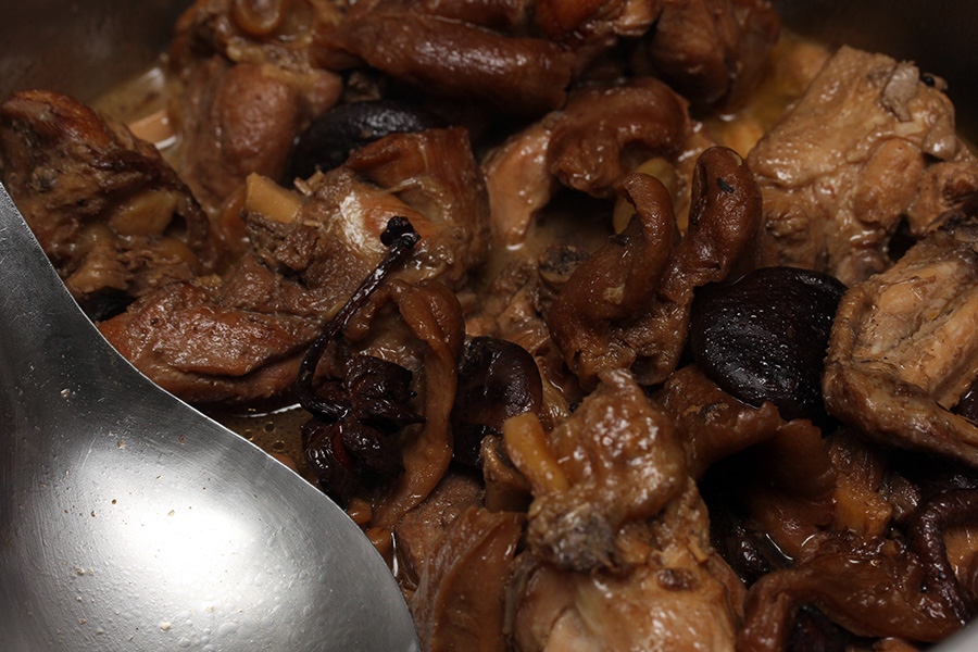 for dinner we had some red roasted chicken with mushrooms (oyster and shiitake). my father kept on telling me how easy and cheap the recipe was and said he'd teach me how to make it next time so i could do it at home.