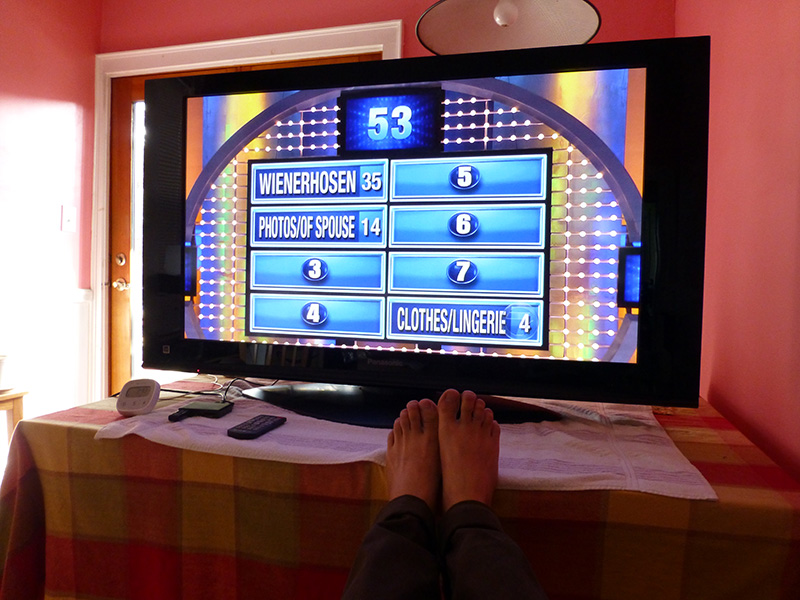 i ate while fiddling around with the newly-fixed HDTV. i was tinkering with it earlier, trying to rig up an antenna so i could receive over-the-airwaves HD channels. when that didn't work, i tried connecting a cable line directly into the television. that didn't work because this particular model only has an ATSC tuner (airwave), not a QAM tuner (cable).