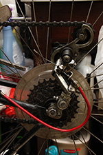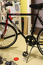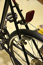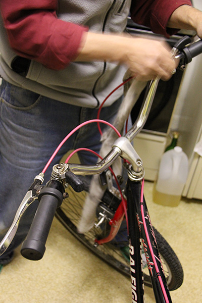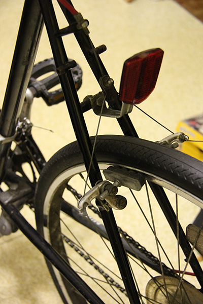 after dinner i helped my father clean up the free raleigh which he brought into the kitchen. earlier i showed him how to remove rust using some aluminum foil. we realigned the front brakes which were uneven - pretty easy to do with cantilever pads. i noticed it earlier but now it was pretty obvious that the rear derailleur was bent out of alignment. we figured it'd be a tough fix but the derailleur bracket is soft enough that my father was able to gently bend it into shape by hand.
