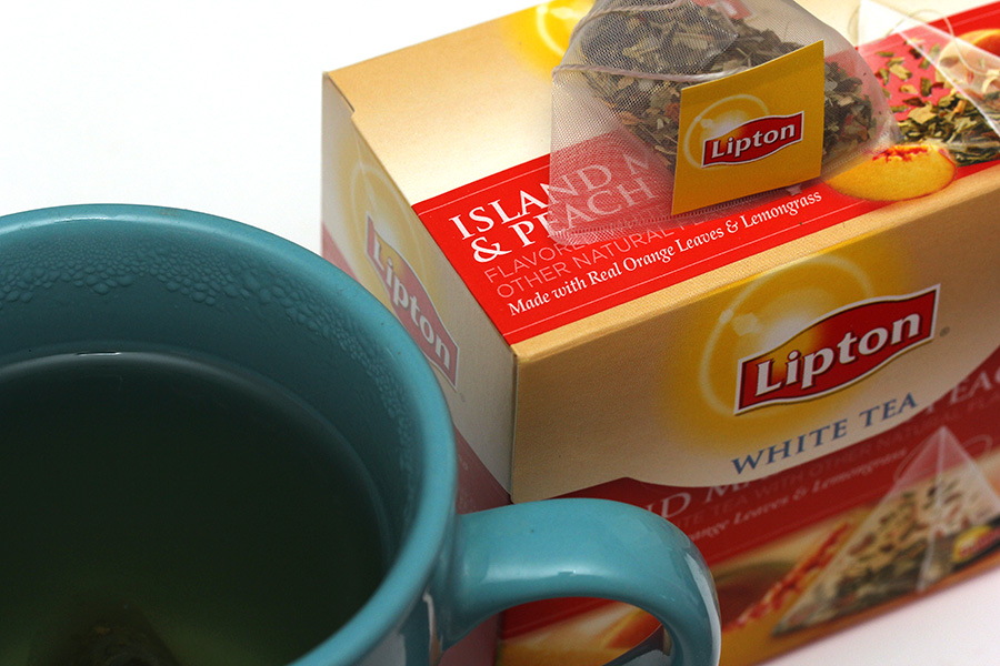 i bought a box of lipton island mango & peach white tea ($2.50) last night. i was drawn to it because the loose leaves come in those fancy pyramid tea bags and one of the ingredients was modified corn starch, which i confused with corn syrup,