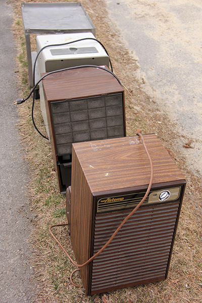 i helped my parents toss out some old broken dehumidifiers from the basement. even after tossing out 3, there must still be 4 more in the basement. soon afterwards a truck pulled up in front of our house and a man came to take the dehumidifiers for scrap metal. he also took a steel wheeled food tray along with several bags of metal coat hangers. my father was outside and asked him if he wanted some used motorcycle batteries, which he gladly took as well.