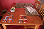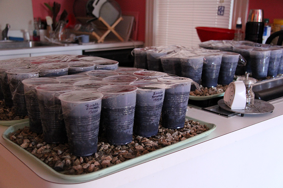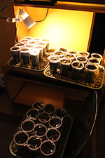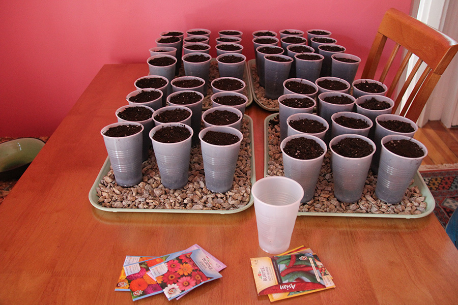 back at home, i sprayed the containers, then planted the seeds, 2 seeds per cup, 6 cups per plant. i then covered up the containers with plastic wrap and put the trays in the warm guest bedroom for germination.