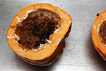 i also finally baked one of my acorn squashes. it's pretty hard so i thought it'd be difficult to cut open, but it was actually pretty easy with a sharp knife. i probably waited too long because the inside seemed all dried up; there wasn't that much flesh and most of it was fibers.