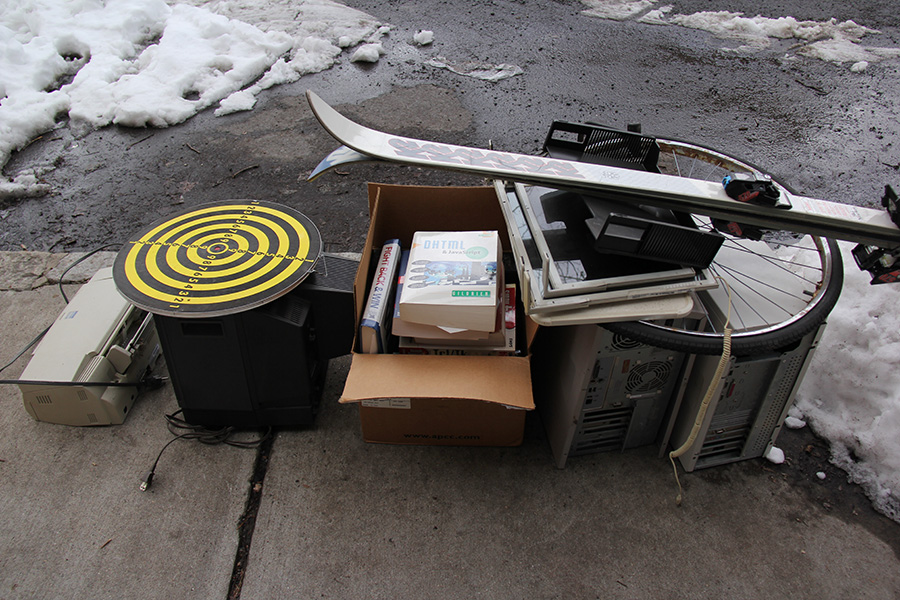 my neighbors from across the street spotted the bread machine right away and asked if they could have it since theirs broke. an hour later some guy in a pickup truck stopped by to rummage through my junk pile, taking only the dart board. by evening there was nothing left except the box of books and the television. there's something satisfying about people taking home the stuff i'm throwing away. it means they won't be going to the trash heap (although i think with things like the computers they're probably going to be reduced for scrap metal).
