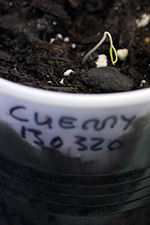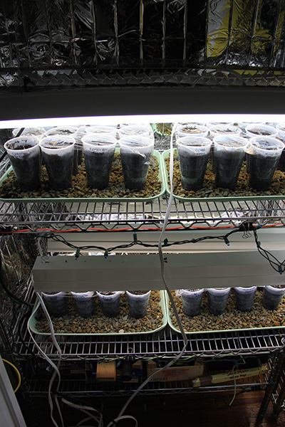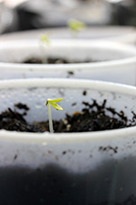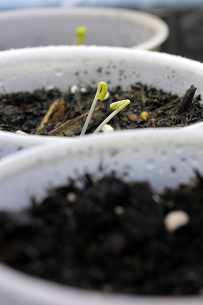when i checked my potted containers this morning i saw a few seedlings. back at home, i hung up my fluorescent lights and moved the plants into the closet. a lot of zinnias have germinated, half of the calendulas, and a single cherry tomato.