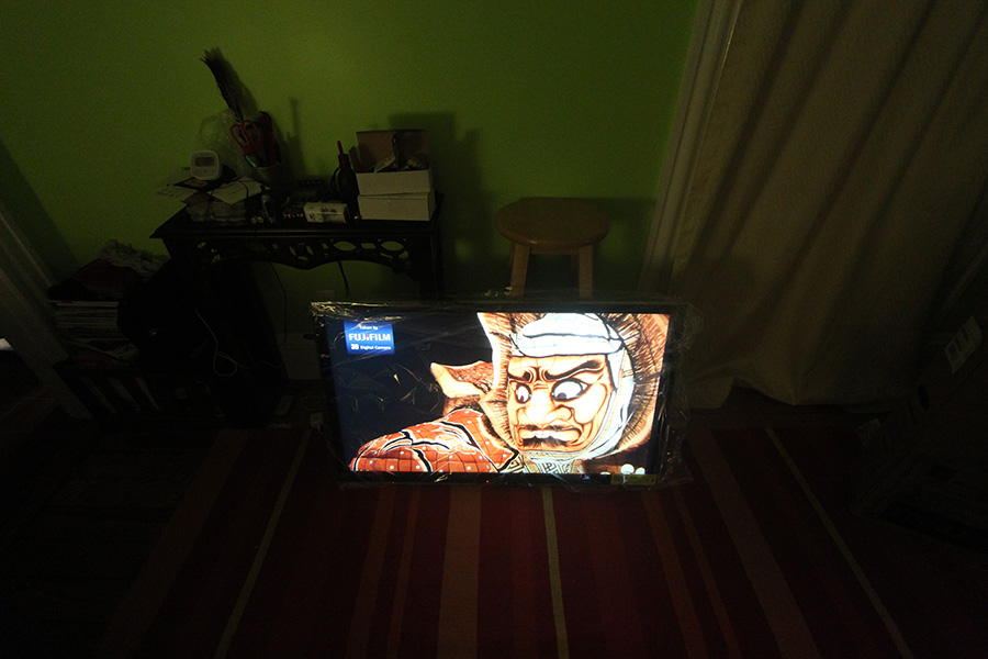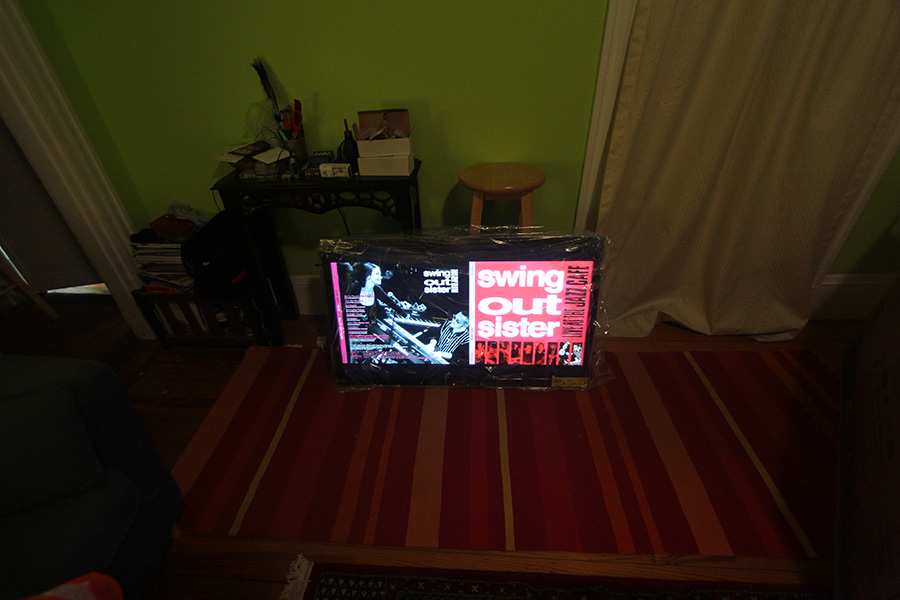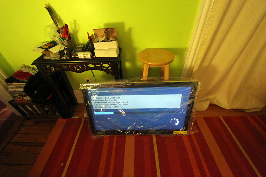 even with the televison out i still couldn't do anything with it since i still needed to put it on its pedestal. i was able to check that the screen hadn't been damaged during shipping since i noticed some of the styrofoam padding were cracked. later in the evening i realized i could still play with the television even though it's not fully assembled yet. so i ripped a hole in the plastic still wrapped around the television so i could plug it in. it flashed to life, asking me to go through the initial setup menus.