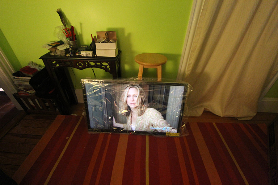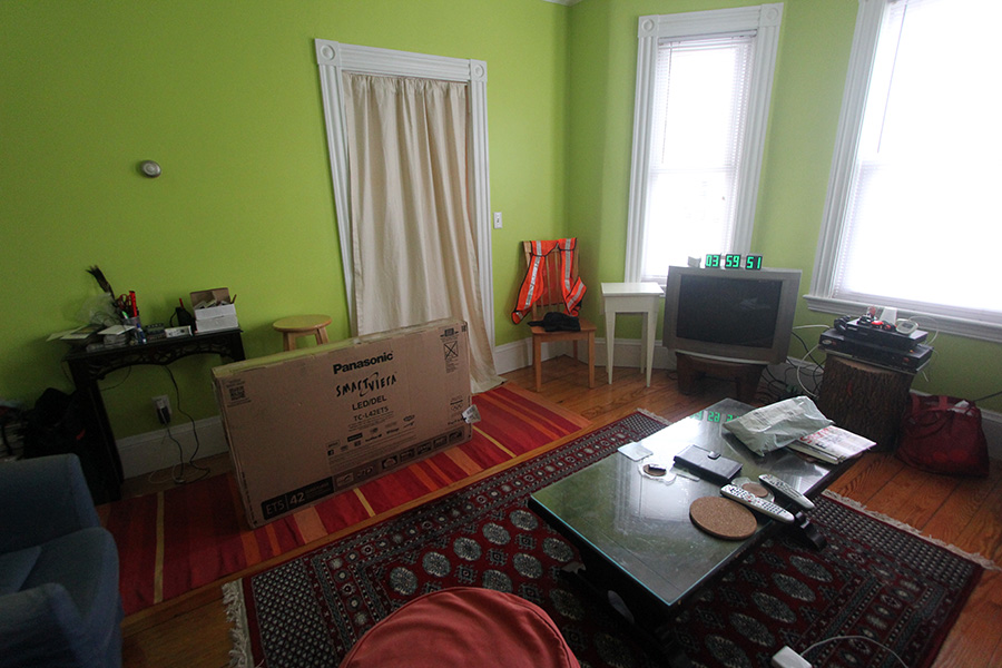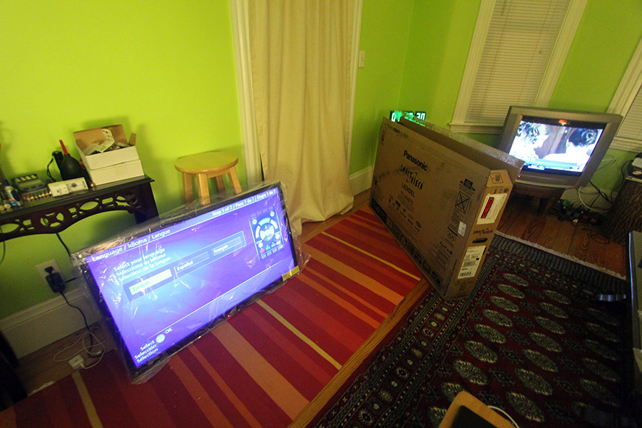 i've been waiting all day but my 42" panasonic viera LED 3D HDTV (TC-L42ET5, $698) finally arrived around 4pm. i asked the UPS delivery guy to bring it inside the house instead of just leaving it on the front porch.1 he hesitated for a split second before seeing my sling and realizing my special condition. i opened up the box, but i couldn't lift out the HDTV with just only one hand so i had to endure the unusual situation of having a brand new television sitting in my living room but unable to use it. if only i could get somebody to help me... as if reading my mind, i looked outside and saw jack coming home from work. after some light chitchat about my broken collarbone, i asked him if he could help me with my television. lifting out of the box is supposed to be a 2 person job but jack just grabbed the HDTV and pulled it out without breaking a sweat. he set it down on the floor for me before leaving.