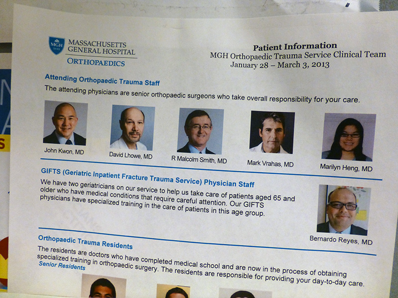 i arrived at 3C yawkey right at 8:30. i took off my jacket in the waiting room. after 10 minutes of waiting an attendant came in and brought me into one of the exam rooms. there was a computer with my x-ray photos (from last week) on the screen. i waited another 15 minutes before a resident came me and asked me to take my shirt off so he could do a quick check of my condition. he left me with some medical forms to fill (kind of weird, given that it should all be in the MGH database already) while i waited for the doctor to show up.