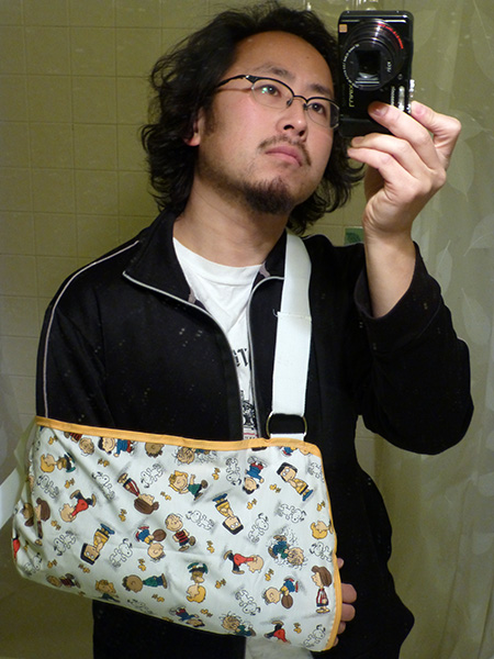after dinner i got a ride back to cambridge. i stopped my father while he was leaving to give him a package that'd arrived, an indoor digital thermometer/hygrometer (you can never have enough of these). inside the house there was another package, this time for me: a snoopy arm sling from frances! she secretly ordered it for me but i accidentally discovered her plan when i accidentally received the invoice from her husband. it's kind of a weird product, seemingly designed for children, but in a size so large it could probably fit a giant. i ended up reducing the strap a lot just so it'll fit. it's definitely more noticeable than the navy blue arm sling they issued me at the emergency room.