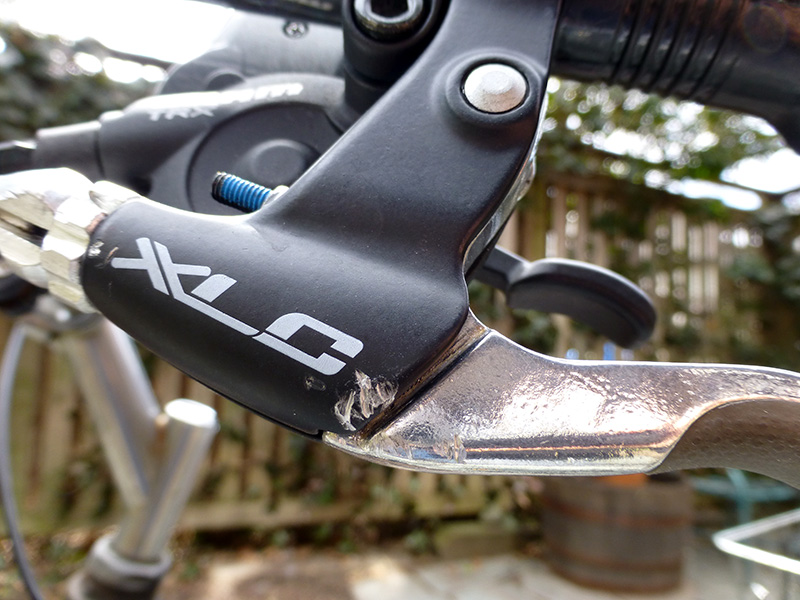 i decided to take a short bike ride, on the pretense of getting some chocolate from rite aid. the hardest part was getting the bike out from the basement. carrying with my right arm, i ended up having to lift with my left to the limit of how much i can raise that arm. there was some pinching pain while i finally pushed the bike out from the basement. just as i remembered, the left brake lever was bent, but nothing i couldn't bend back. there was some scratches on the lever housing as well, but that was the extent of the damage. i was relieved that the wheels both seemed fine, and that they weren't bent when i fell. i noticed that the front gear was on 1, which corroborates with what i remember from the accident, that the chain skipped down to a looser gear.