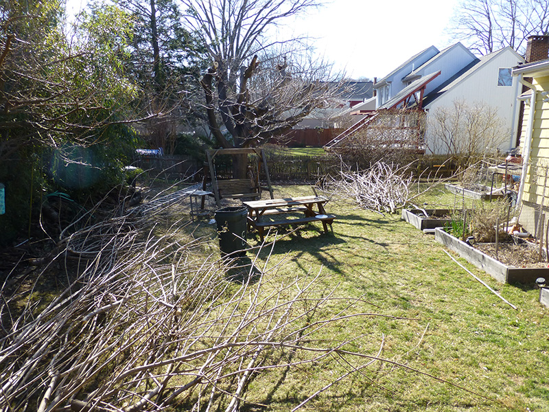when we finally finished after a few hours, there was hardly any branches left on the maple, since they were all cut down, lying in tall piles on the lawn, waiting to be disassembled and placed into barrels for biweekly garden refuse pickup.