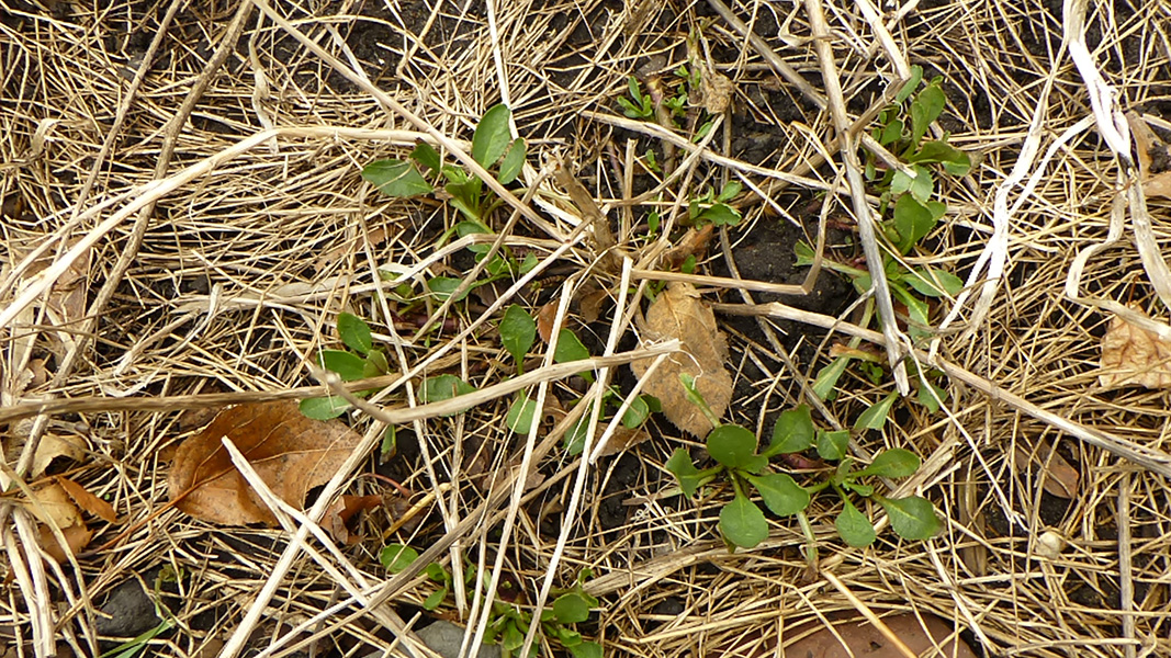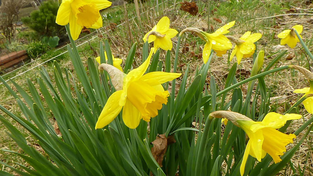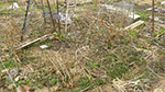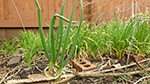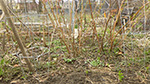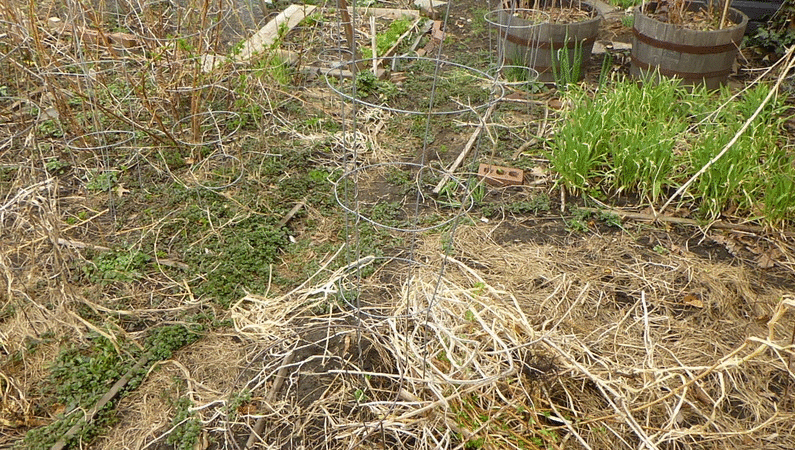 since i was already dressed, i decided to pay a visit to the community garden. it'd rain earlier in the morning but was dry now, although some areas were muddy. the water had already been turned on. the last time i was there was at the end of november, almost 5 months ago. the garden was empty. i was glad to see all my tomato cages were still there (that they hadn't been blown away by the winds). ground ivy had started to take over my plot again. the raspberries were starting to leaf out and i trimmed the canes down to 3 feet tall. i spotted some perennial daisies from last season, as well as a 2nd year money plant i'd transferred from my parents' backyard. i had a large patch of garlic sprouts and some thick scallions.