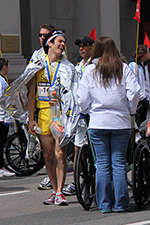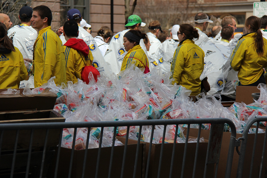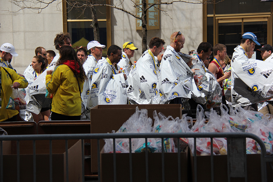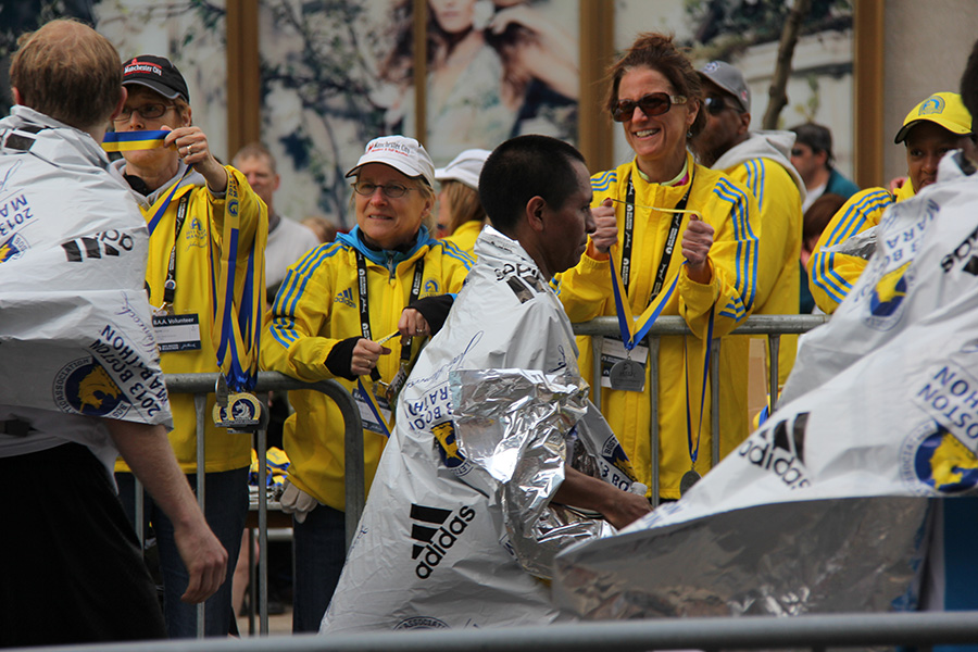 i watched as the finished runners received a mylar blanket, a marathon medallion, complimentary water and/or gatorade, and a gift bag containing snacks and goodies. i left around 1:30, following boylston back to berkeley, then to stuart to retrieve my bike. i managed with my broken collarbone, although i couldn't sling my camera across my left shoulder, so i just wore the strap around my neck.