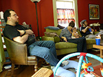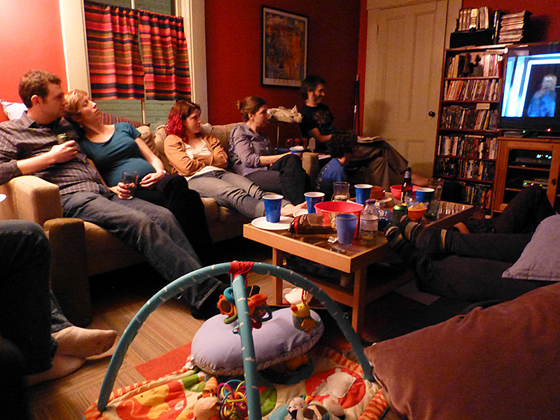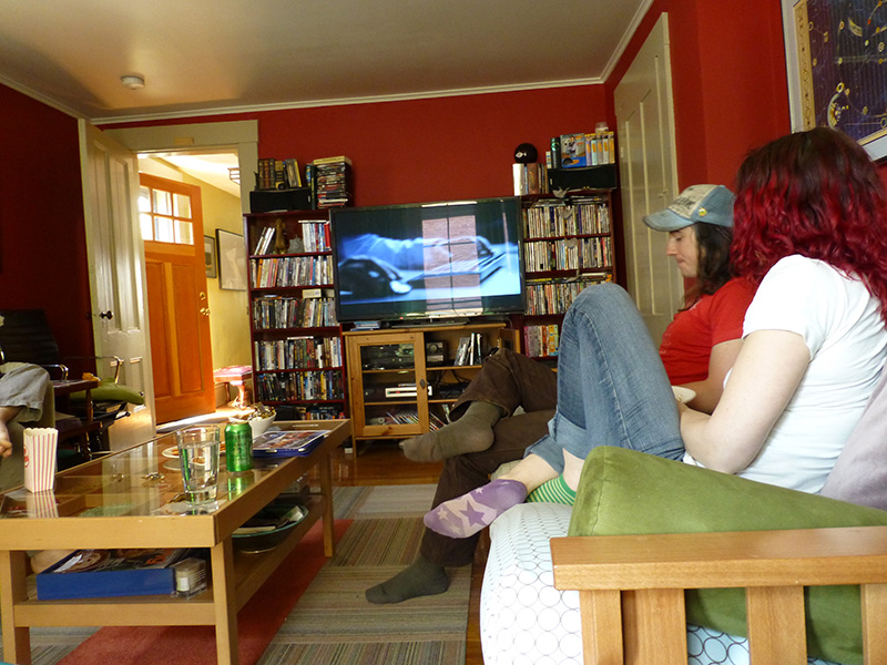 i left the house around 11:30 for elias' annual birthday marathon. for this special occasion i wore my red jeans for the first time. it's been more than a year since the central square wendy's closed down so now my only food option1 was moody's falafel palace, where i picked up a lamb gyro sandwich ($5.50) before arriving at elias' place at 11:45. i'd also brought a case of seagram's ginger ale.2 mike arrived a minute after me, stopping by mary chung's for his traditional marathon meal of chinese takeout. we had our pre-marathon chitchat in the kitchen, where i got some more details about alvida's delivery and learned from mike that they put fish bladders (called isinglass) in guinness (much to chagrin of vegans like his wife kathy). elias' sister chloe drove down from vermont with her friend carrie.