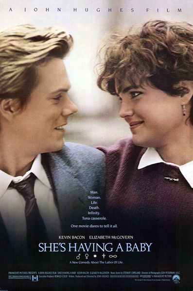 the 80's baby movie filled the 6:00 timeslot. she's having a baby (1988) won against three men and a baby (1987). i voted for she's having a baby because i wanted to see a young elizabeth mcgovern after watching her play lady grantham in downton abbey, even though i also really wanted to steve gutenberg in three men and a baby. she's having a baby is an awful movie, mostly about the insecurities of a young newlywed man (kevin bacon) against the backdrop of late 80's hedonism and suburban consumerism. the actual baby part doesn't arrive until the end of the movie (spoiler!). also noteworthy is a very young (and very hairy) alec baldwin. the best part of the whole movie is actually the end credits, where various 80's celebrities pitch baby names.