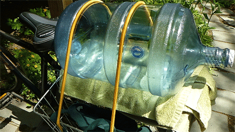 the jug was smaller than i expected, and much lighter. i'm just used to them being full of water! i laid down some towels on my rear rack and secured the bottle with some bungie cords. the bottle is from a company called pure water health out in california. the one i got retails for $23.50.