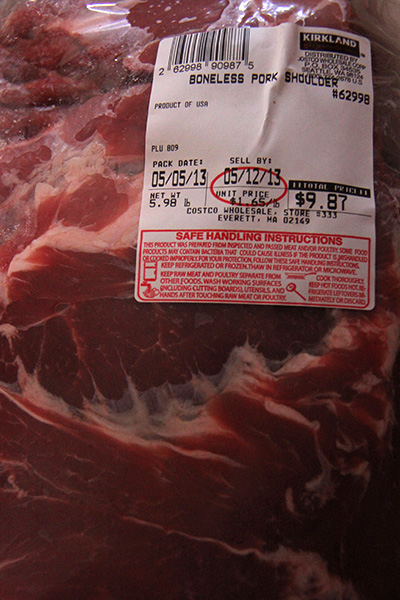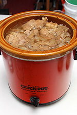 i make pulled pork at least once a year (2010 2011 2012). my parents got me a 6 lb. pork shoulder when they went to costco yesterday. unlike the last 2 times where i used picnic roasts (essentially the same pork shoulder region), this particular cut was boneless and skinless, which made for easier cooking. i quickly cut up the shoulder into large chunks just barely big enough to fit inside the crockpot. 6 lb. of meat is the maximum amount my crockpot can handle. the pork was interspersed with 3 layers of chopped onions, garlic, and ginger, to that i then added a cup of rice wine and enough boiling water to almost cover everything. i set the crockpot on high and left it alone. it was right around noontime.