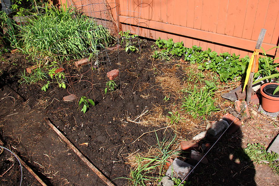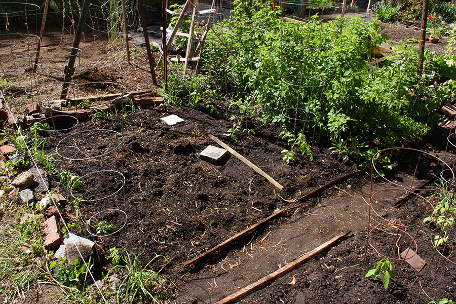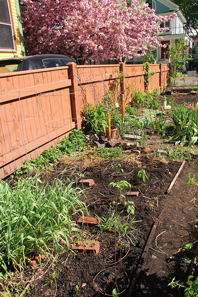 with that i officially kicked off the 2013 gardening season. i didn't check, but i'm probably the first person in the community garden to have planted tomatoes. these plants have been slowly hardened in my backyard for more than a week, so i think they're ready for the big league.