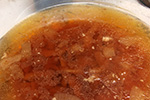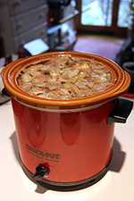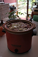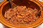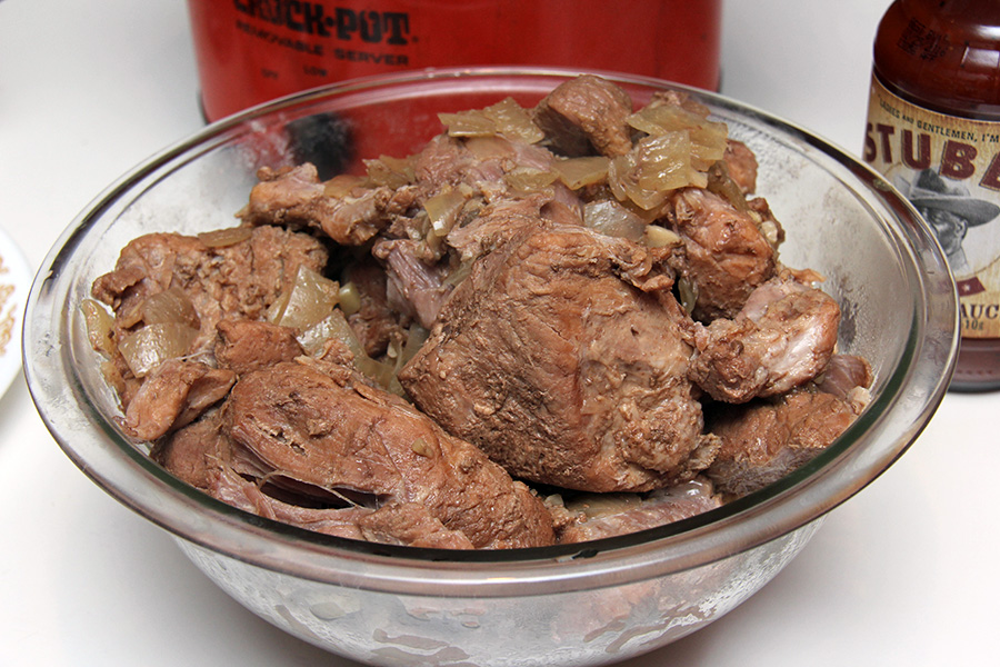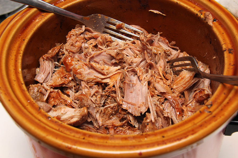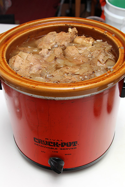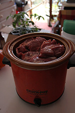 returning home, i saw that the crockpot had overflowed while i was away. it wasn't too bad, and nothing spilled onto the floor, just some liquids on the countertop. i moved some of the pork pieces so those on top (which seemed a little dry) could spend some time on the bottom.