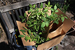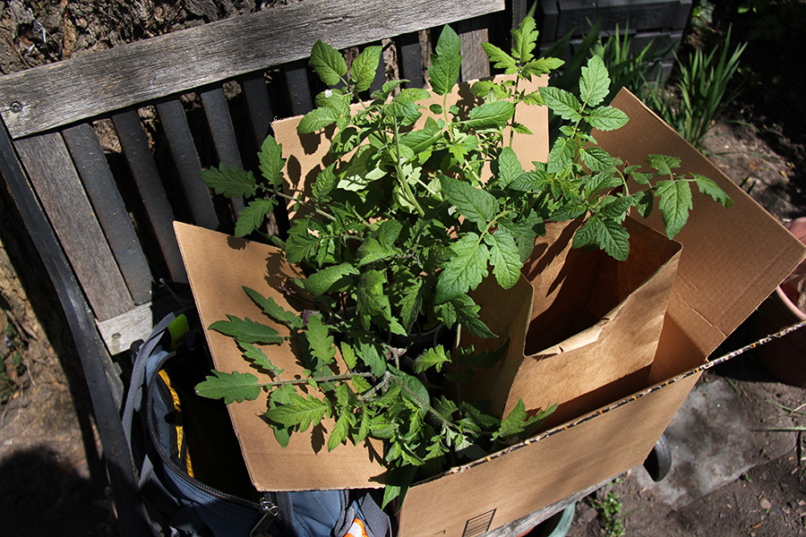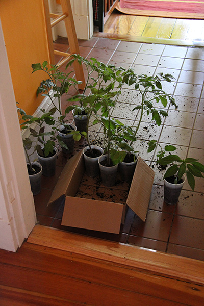 may is traditionally graduation month here in boston. likewise, it's also the time when my indoor plants graduate to their outdoor location. i had so many different seedlings on my porch that it felt like i was at the garden store. i ended up picking 2 of each: best boy tomatoes, cherry tomatoes, roma tomatoes, and kung-pao hot peppers. i never spilled my plants once until today, when the box fell out of my hands and crashed to the floor. fortunately none of the plants were damaged.