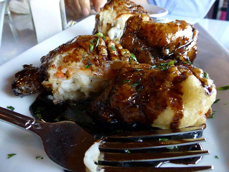 the reason for the treat was dennis had a gift card he wanted to use up. i didn't eat all day so i was pretty hungry. between the appetizers and our main course there was a long wait, which we didn't mind since it let us rebuild our appetite. the daily special menu nearly equalled the selection on the regular menu, so we ended up ordering mostly from the specials. the food was good and the price very reasonable. the restaurant didn't empty out until nearly 3:00, so that'd be a good time to come in the future, even though it'd be kind of a weird time (between lunch and dinner). the lobster fritter was a culinary delight, almost like a dessert with the drizzled reduced sweet balsamic vinegar sauce, fried dough with stuffed lobsters. the portions on the main course were huge, and none of us could eat more than half (seems like a common problem, most people left with doggy bags).