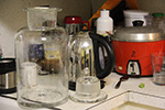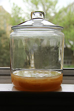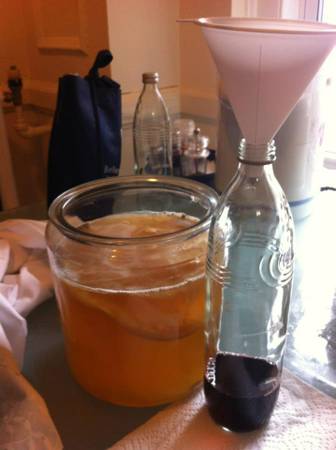 jimmy met me outside his apartment. he had sleepy eyes and a relaxed manner, and i wasn't surprised when he said he was from the west coast (came to boston to get his MBA). he took me upstairs into his apartment to show me his kombucha setup. his place was a little messy since he's in the process of moving out. on his kitchen table he had 2 glass jars (gallon size), one was empty, the other was filled with a stack of scoby's. on a dish he had 2 additional scoby's submerged in some liquid. there were also a few bottles of kombucha, which looked like grapefruit juice. there seemed to be something illicit about it, even though it was quite the contrary. i couldn't help to think there were fetuses floating in the jar, and that this was some sort of back alley hospital.