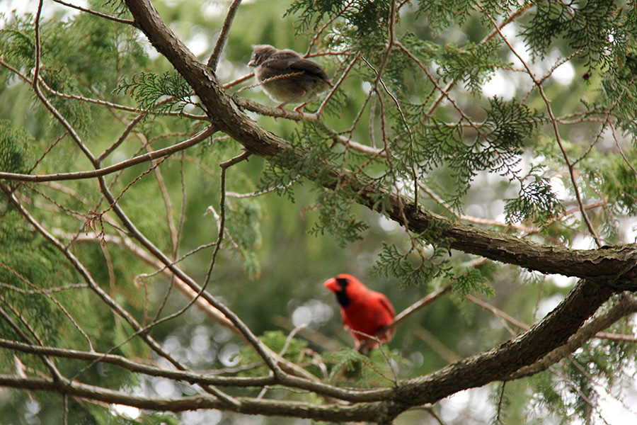 was there a nest up in the dead elm tree? the thought did cross my mind, but the only nest i've ever seen up there was an old squirrel drey made from dead leaves. however, after the tree was gone, we saw a baby cardinal hopping around nearby, with 2 frantic parent birds. the baby was old enough that it could fly short distances, but the parents still hovered nearby. hopefully they'll be okay, and weren't displaced when the tree was taken down.