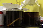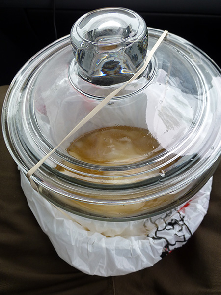 to speed the cooling time, we mixed a gallon of spring water we had on hand with the concentrated brew of warm black tea and sugar. so into each jar was essentially: about a gallon of black tea (8 bags), 1 cup of dissolved sugar, 2 cups of kombucha juice, and one scoby. we covered up the jars with paper towels and some rubberbands. now we wait for the new scoby colony to form on the surface.
